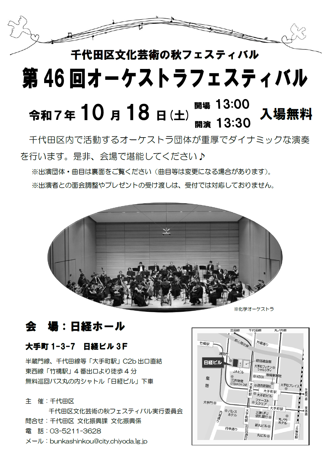 千代田区内で活動するオーケストラ団体が重厚でダイナミックな演奏を行います。是非、会場で堪能してください